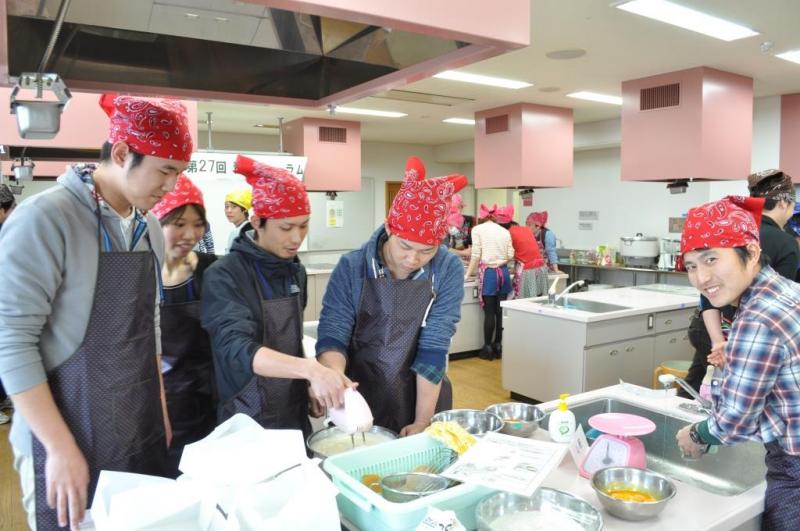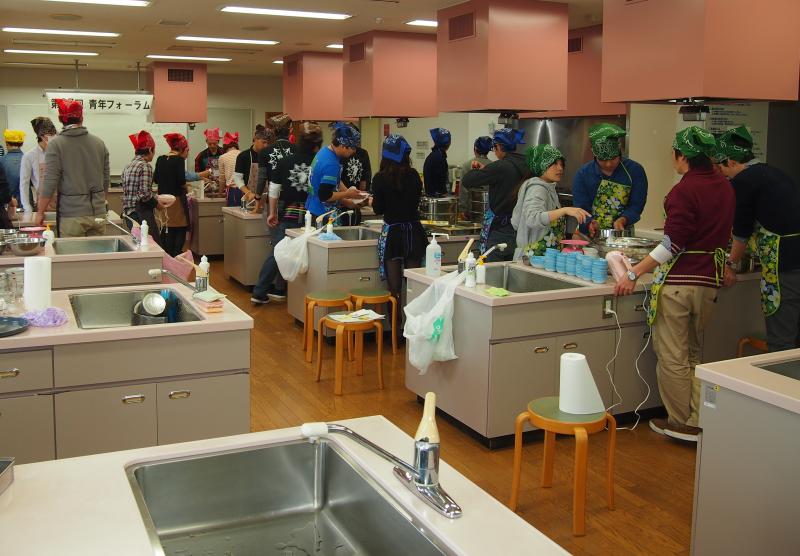 1日目は、調理班より「『食』を知ろう!」と題して、全ての生活の基本になる「食」を通して自分や世界が置かれている状況を認識し、意識を向けられる人材育成を目標に講義と調理実習を行いました。 始めに、一度は聞いたことのある「食物の成分やTPP、GDP」について講義を行い、「食」の大切さや現在の状況、国が進んでいこうとしている食産業などについて参加者全員で共通認識に立ちました。その後、グループに分かれて、それぞれのグループで用意したレシピから九州各地にある銘菓を決め、参加者が自律的・自発的に生活の質を向上させ、さらに「食」に興味を持つよう、調理実習を行いました。