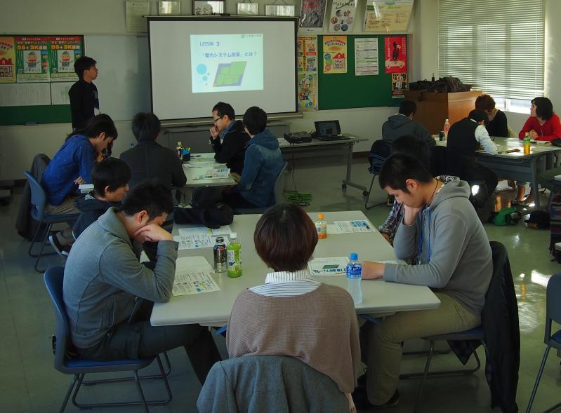 2日目は、勉強班より「電力システム改革」をテーマに座学での知識習得のあと、グループワークにて、「電力システム改革を行うことで、電気料金は本当に安くなるのか?」や「電力システム改革が実施されると、私たちの仕事と暮らしはどのように変化するのか?」など、4項目に関してグループ論議を行い、各参加者の思いや考えをまとめ、全員の前で発表することで、現状の電力関連産業が直面している問題に対して共通認識を持ちました。また、各参加者が自らの考えで、自らの言葉で伝えることは、周囲の様々な人々へのメッセージ発信力の向上にもつながったものと思います。