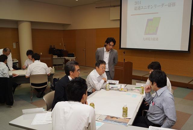 冒頭、久保会長から「組合役員に期待すること」として役員の基本的心構え、春闘における基本的考え、男女共同参画の重要性など幅広い観点からお話しをいただきました。続いて、「電力関連産業を取り巻く環境他について」現状と九州電力総連としてぜひとも理解しておいていただきたい重要事項について堂原事務局長から説明を受けました。その後、今回の研修のメインテーマとも言える「労使協議の基本について」参加者が4班に分かれ、演習を通じて職場での問題点の洗い出しを行い、執行委員として模擬労使協議での課題解決方法、そして模擬職場集会での職場への説明・報告について富士社会教育センターの木村講師より学びました。労使協議では、受講者も緊張していましたが、会社側として対応する事務局も実践さながらの対応に緊迫感を持って対応していました。事務局として対応いただいたQBSユニオンの中村委員長からは、『日頃、会社側に対して意見を言う立場だが、逆の立場になって会社側の気持ちもわかった。本音とは違うことを言う場合、相手から確信を指摘されるとその意見に共感する』とあらたな気づきがあったと話していました。 夜は、全員が宿泊し夜遅くまで膝を交えて単組の垣根を越えて情報交換を行っていただきました。