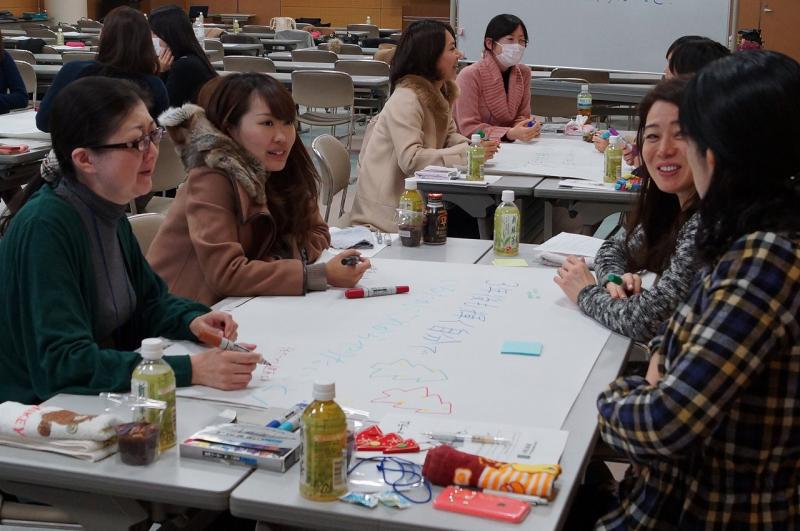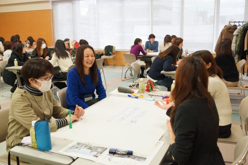 その後、スタッフのささやかながらの気持ちを込めたクリスマスオブジェを置いて雰囲気をかもしだした席へ移動をおこなってもらい、10グループに分かれて 『3年後も輝く自分でいるためにこれからやりたいこと』 をテーマに、ワールドカフェ方式によるフリーディスカッションをおこないました。女性委員会メンバーのユーモアあふれる進行に、初めてあう参加者もすぐに会話が弾み、たくさんの仲間とのコミュニケーションを行なう中、活発な情報交換が行なわれ、和やかな雰囲気にて終了しました。