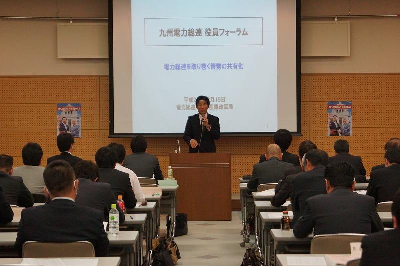 九州電力総連は、12月19日(金)15時より、「2014年度 総連役員フォーラム」を開催しました。 第1部では、「電力総連を取り巻く情勢の共有化」と題して電力総連 社会・産業政策局 伊藤次長に講演していただきました。「原子力発電が長期にわたり停止している現状で、海外からの化石燃料依存度が第一次石油ショック以上となっている。それに伴い、電気料金の高騰やCO2排出量も増加している。原子力発電は、電気料金が安く大規模な電力供給が可能であるが、一方で様々な要因により混乱を招いている。私たちは、これまで以上に万全な安全対策を行い電力の安定供給体制に取り組まなければらない。また、電力システム改革や無電柱化、再生可能エネルギー導入など、様々な諸課題に対しても、多くの方々が関わる中で、職場で働く組合員の気持ちを代弁していただいている。また、5年ぶりに見直しが行われた電力総連の政策制度要求の政策実現に向けては、組織内議員・電力総連・構成総連・県電力総連・加盟単組が一体となって取り組んでいかなければならない」と述べられ気持ちを一つにしました。
