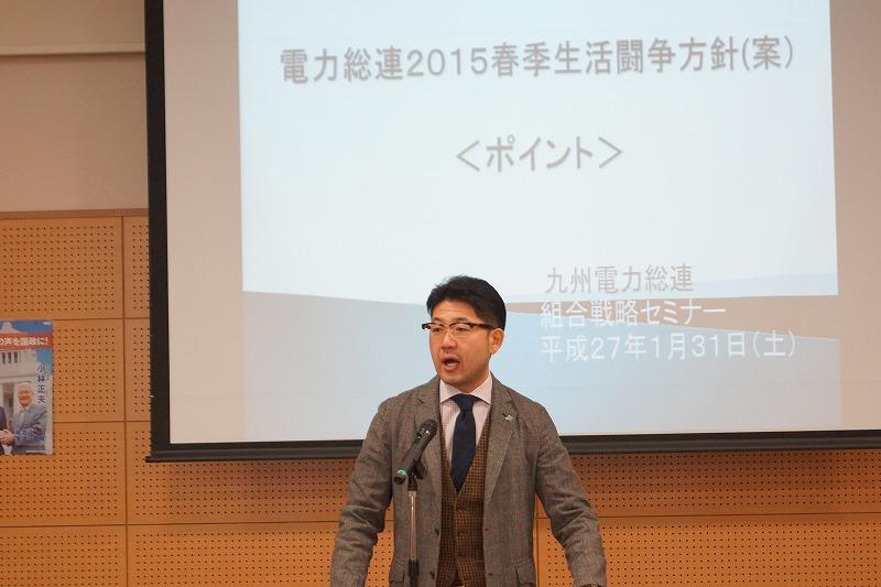 電力総連:労働政策局の川村部長からは、春闘交渉を迎えるにあたっての全国の2015春季生活闘争方針(案)のポイントについて説明いただき、九州電力総連の栁瀬副事務局長からは「賃金分析からみる春闘交渉のポイント」について説明し、各加盟単組で自組織の賃金を分析することで説得力のある賃金引き上げ要求を行っていくことが必要であると再認識しました。