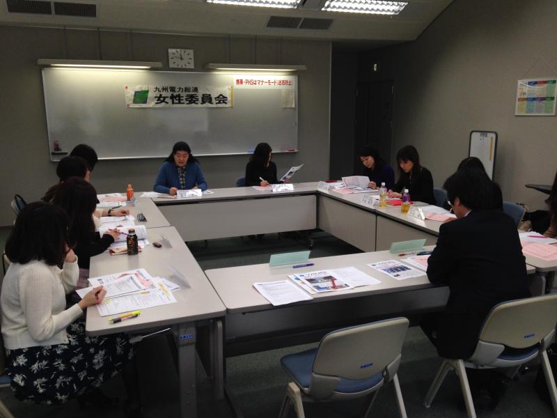 最初、玄海原子力発電所訓練センター内会議室において女性委員会を開催し、昨年12月に開催した2014女性フォーラムについて参加者アンケートをもとに総括を行いました。また、2014年度活動全般についても振り返り、次年度に向けた活動の補強について論議を行いました。