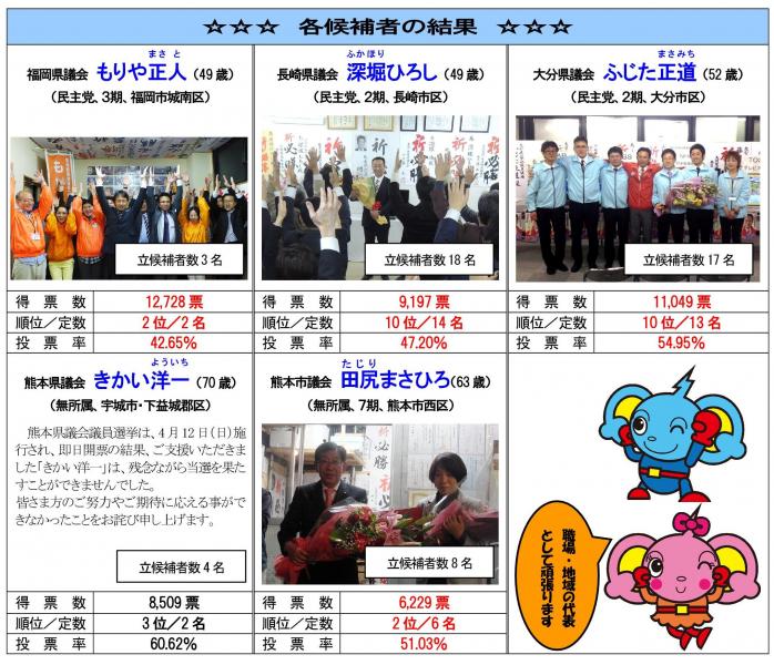 第18回統一地方選挙(県議会・政令市議会議員選挙)が、4月12日(日)に即日開票され、九州電力総連の組織内推薦候補者5名のうち、4名が当選を果たしました。 当選された議員のみなさまについては、これからの任期中、地域および職場の声を政治に反映していただくようお願い申し上げます。 私たちも政治活動の場を通じて、議員のみなさんと連携を深めてまいります。