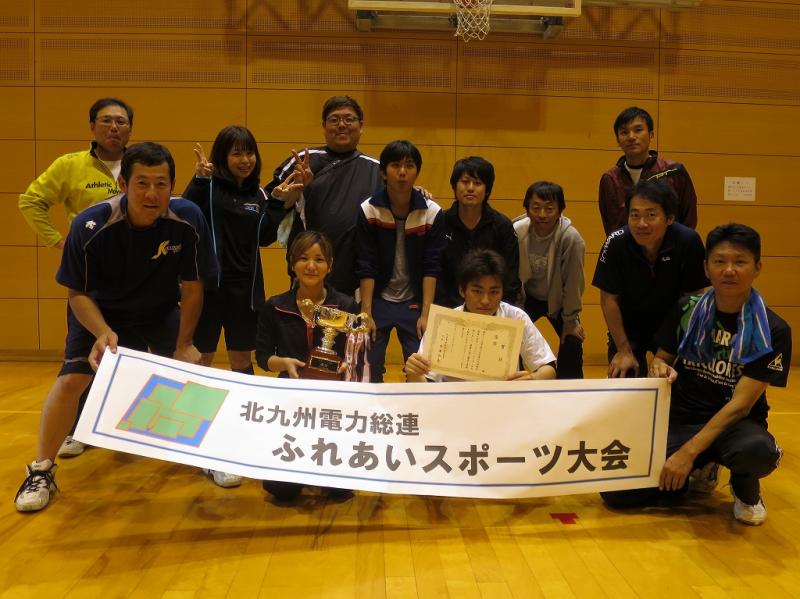 10月17日(土) 新門司体育館において6単組8チーム80名の組合員とご家族参加の下、平成27年度北九州電力総連ふれあいスポーツ大会を盛大に開催しました。今年は、九州労働金庫小倉東支店からも磯部支店長はじめ5名の方に参加をいただき、組合員とのふれあいを通じて労金運動を知っていただくとともに大会を盛り上げていただきました。 平成15年より12連覇を果たしている北九州LNG労組「北エルロマンス」チームの連覇を他のチームが阻むのかどうかが今年の大会でも大きな話題となっていました。例年、参加チームの力も向上しており昨年優勝戦を争った九電ユニオン「トリッカーズ」チームには、特に期待がかかっていました。 予選リーグは、2グループ・4チームに分かれて2試合を戦い、上位2チームが決勝トーナメントへ進出。下位チームは、交流戦で交流を深めるというものです。 予選から熱戦が展開される中、北エルロマンスチームは順調に2勝をあげ決勝トーナメントへ進出。昨年準優勝の九電トリッカーズも、選手が途中で軽いねんざとなり戦力ダウンの中、順当に決勝リーグに進出しました。そのほか、九電工労組「九工チャレンジャーズ」、西プラ労組「仕事大好き リーマンブラザース」が決勝リーグへ進出しました。決勝リーグ開始前には、きいたかし元衆議院議員も見えられ参加者のみなさんに激励の挨拶をしていただきました。 準決勝では、順当に「北エルロマンス」が勝利。「九電トリッカーズ」もフルセットの末「九工チャレンジャーズ」に勝利し、今年も昨年と同じ決勝のカードとなりました。 決勝戦でも地力に勝る北エルロマンスチームは、激闘の末、2-0で勝利し、見事13連覇を達成しました。 北エルロマンスチームは、11月7日に開催される九州大会に出場します。今年こそは、九州大会での優勝を期待しています。