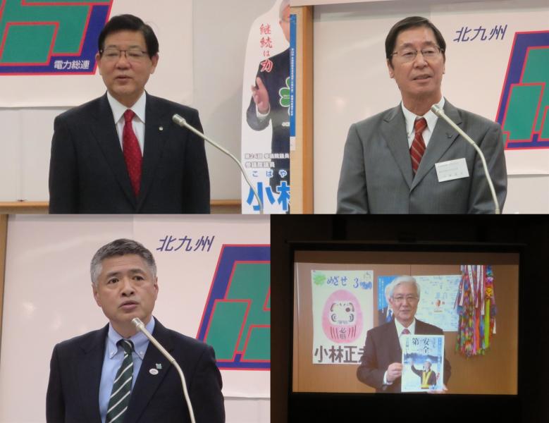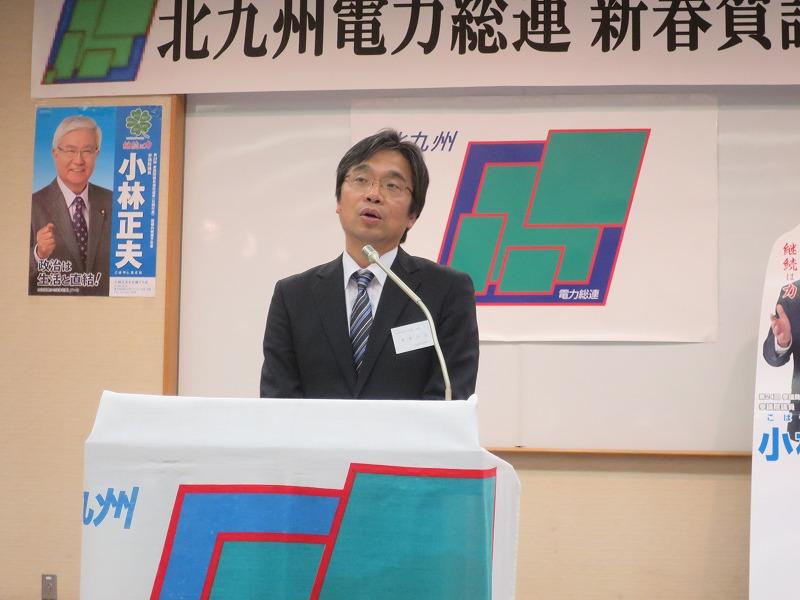 来賓として、北橋健治北九州市長にご出席をいただき電力総連の仲間への激励の祝辞を頂きました。また、企業側を代表して小倉良夫九州電力北九州支社長、上部組織である九州電力総連 久保友徳会長にもご祝辞を頂戴しました。さらに、小林正夫参議院議員もビデオレターでご祝辞と夏の参議院議員選挙に向けた力強いメッセージをいただきました。 電力を取り巻く環境は、厳しさが続いております。 この難局を皆さまと乗り切っていくために、各単組執行部との連携強化を図り、事務局も一緒になって努力していく覚悟で活動を展開いたしますので、本年も変わらぬご協力をお願い申し上げます。