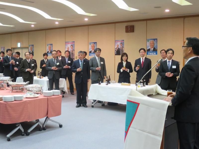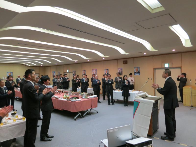 主催者を代表して、堂原会長から「台風15号による災害復旧、川内原子力発電所再稼働、年末年始の安定供給および電力自由化に向けて対応する全ての関係者への謝意がのべられ、どんなに環境が変わろうと先輩たちから受け継いだ電力安定供給のDNAは大切な宝物であり今後も絶対に失ってはならない。今年度は、2016春闘をかわきりに、4月の小売全面自由化、7月の小林正夫参議院議員の勝利に一丸となって対応していこう。また、安全については、何気ない日常が当たり前となるよう安全衛生活動に労使一体となって取り組んでいこう」と決意がのべられました。また、電力関連産業は、今後ますます、厳しい環境にさらされていくことになるが、人気ドラマ「下町ロケット」の一説を引用し「困難な中にこそチャンスがある。電力総連一丸となって全ての困難に勝利していこう」と参加者全員に呼びかけました。