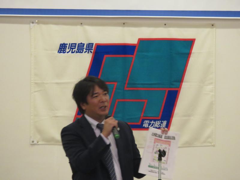 はじめに、主催者及び企業側の代表挨拶の後、九州電力総連竹本副事務局長、九州電力(株)鹿児島支社出口安全担当から、災害の発生状況と安全衛生活動の取り組みについて報告があり、「各企業・各労組での安全衛生に対する継続的な取り組みはなされているものの、災害の発生に歯止めがかかっていない状況である」ことが報告されました。