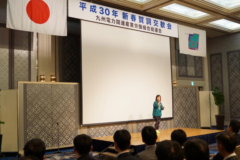 九州電力総連は平成30年1月11日、電力関連産業労使の関係者約440名出席のもと、新春フォーラムを開催しました。今回のフォーラムは「絆を信じて」をテーマに九州電力関連産業の連帯感をより一層強め、厳しい状況を打破すべく、リオパラリンピック視覚障がい者女子マラソン銀メダリストの「道下美里」選手をお招きし、ご講演をいただきました。道下選手は昨年12月の防府読売マラソンで世界記録を更新されるなど、輝かしい実績を誇っています。道下選手は伴走者の「河口」様と共にランニングで入場され、講演では人生を変えてくれた3人の恩師の方との出会い、伴走者含む「チーム道下」の信頼から「絆」の大切さ素晴らしさを伝えていただき、「皆さんの一言しだいで部下のやる気スイッチを押すことが出来る」と激励をいただき、講演を終了しました。また、3名の出席者から質問をいただき、マラソンと出会う前は努力することが苦手だったことや視覚障がい者との接し方等も教えていただきました。道下選手のこれからの活躍に皆さんの応援よろしくお願いいたします。