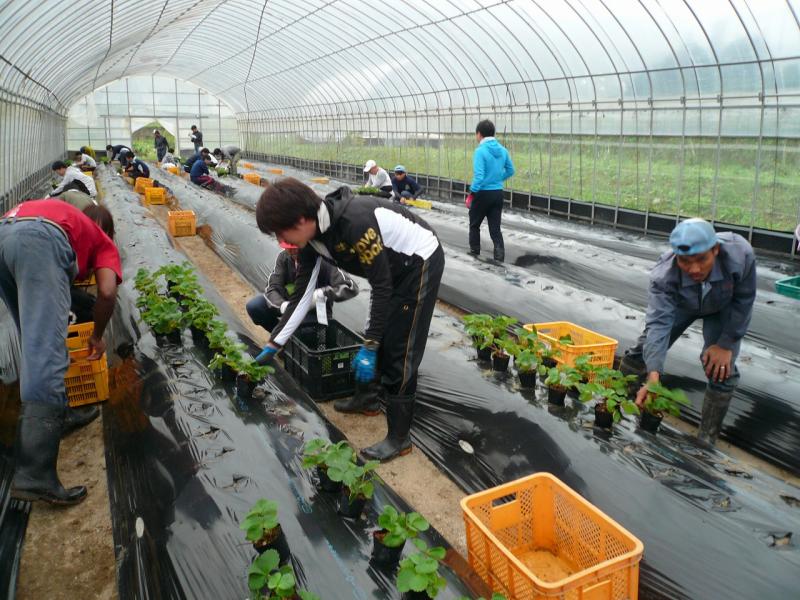 九州電力総連は、平成29年10月13日(金)~15日(日)、19名の参加のもと九州ハートネット21研修会として、「国際交流・農業体験研修」を開催しました。本研修は、昨年度、九電生協と合同で九州電力総連50周年記念事業として開催したもので、好評であったことから、今年度は九電生協の協賛のもと九州ハートネット21研修会として開催しました。開催にあたっては「九州ハートネット21記念の森事業」でもお世話になっている(財)オイスカにご協力いただき、西日本研修センターにて、海外から農業等の研修で来日されている方々との国際交流や作物の収穫などを体験し、異文化や環境、食に対する知識の醸成を図りました。 海外からの研修生21名は東南アジアを中心とした全9か国から来日し、1~2年間農業を中心とした知識を習得、帰国後は自国の発展に尽くすという大義を持って日々研鑽されています。国際交流では、その研修生の方々とのコミュニケーションで、各国の状況や環境、日々の研修内容、帰国後の展望等を紹介いただきました。また、センターでは毎朝、各国の国旗を掲げ、研修生が自国に対して敬意を表すとともに誇りを持って来日していることも強く感じました。 農業体験では、イチゴの定植から始まり、研修生の個人管理畑での作業、稲刈りなど日常の生活ではできない体験をしました。また、鶏の解体も体験し、「命をいただく」ことへの感謝を再確認させられました。私たちは普段当たり前に食事を摂っていますが、農家の方々の苦労や生ある者の犠牲があることを忘れてならず、「いただきます」の意味を考える機会となりました。 3日間という短い期間でしたが、参加者は日本に居ながら貴重な体験ができました。 本研修は次年度以降も継続して開催予定です。多くの参加希望者をお待ちしております。