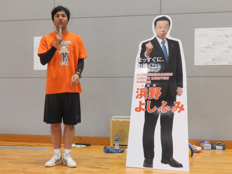 冒頭の黒江会長あいさつ、組織内議員三反園鹿児島市議のあいさつの後、恒例になった鹿児島弁のラジオ体操で準備運動を行い、5単組7チームにより、「ふれあい」を目的に、家族も交えて、楽しくプレーしました。