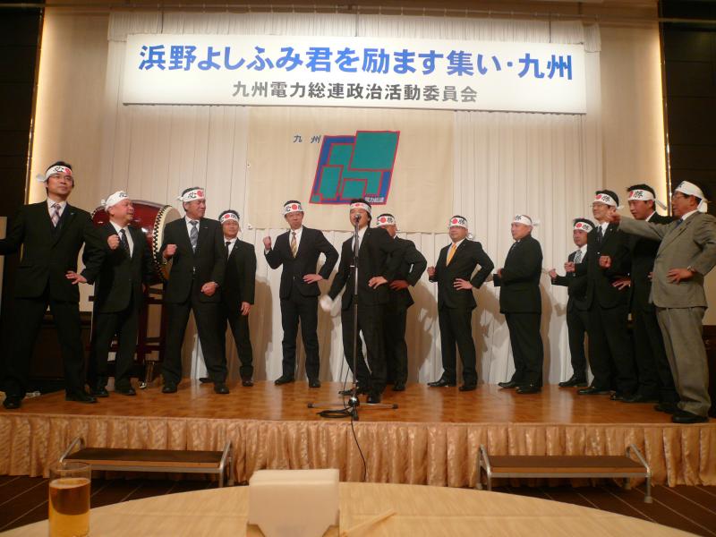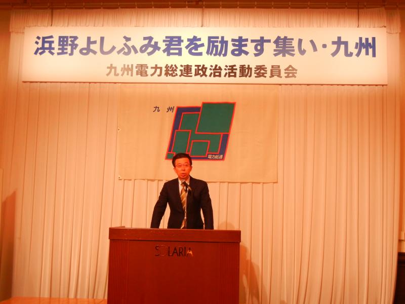 九州電力総連政治活動委員会は、3 月 2 日(土)福岡市内のホテルにおいて、「浜野よしふみ君を励ます集い・九州」を開催し、総勢 90 名の参加のもと「浜野よしふみ」組織内候補予定者の必勝に向け、組織の総力を挙げて戦うことを誓い合いました。