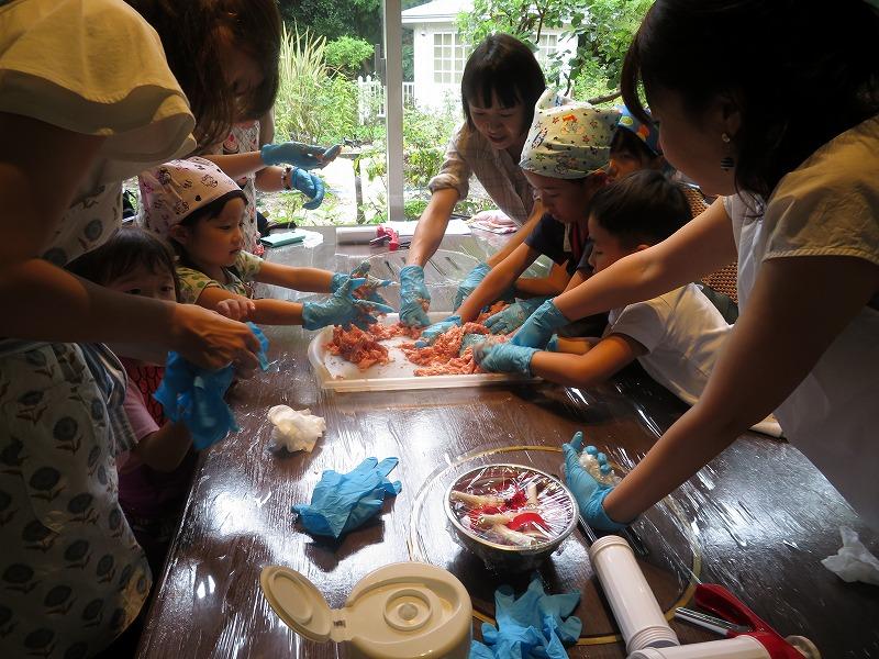 教室では、参加者を9班に分け、班ごとにソーセージ作りを体験していただき、最後は出来立てのソーセージをホットドッグにして、スタッフが用意したフルーツポンチと一緒に食べていただきました。