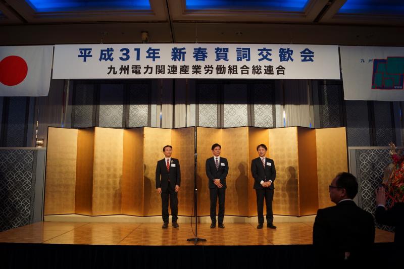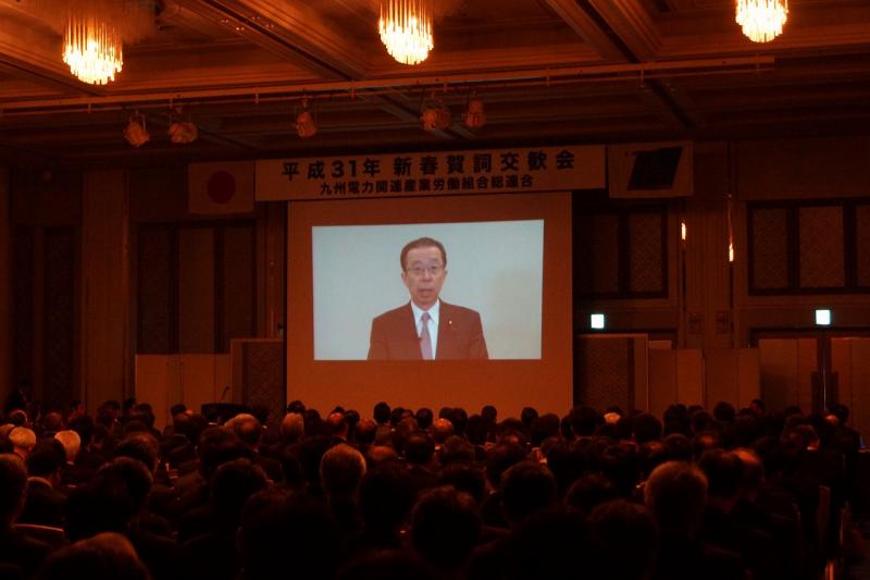 新春フォーラムに引き続き開催された賀詞交歓会(式典の部)では、冒頭、主催者を代表して、九州電力総連林会長より挨拶をし、昨年発生した死亡災害を受け、『こうした悲惨な事故は「2度と起こさない・起こしてはならない」との決意を、労使双方で共有するとともに、新年を機に「安全第一・安全は何より優先する」を固く、固く誓い合いたい』と述べるとともに、昨年の電力関連産業の動向から『多くの皆さんの並々ならぬご尽力により、念願であった「原子力の4基体制」が整い、私たちに「元気と今後に向けた希望」を与えてくれた。改めて、関係者の皆さんのご奮闘に、心より感謝と敬意を表する。この「元気と希望」を糧に、「反転攻勢」との思いを持って、諸課題に挑んで行かなければならないと』と感謝と決意を述べられました。
