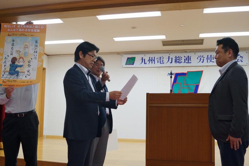 2018年度の災害発生状況と活動報告、そして2019年度へ向けた安全の取り組みと“死亡災害”・“重大災害撲滅”へ向けた思いを報告しました。また、2019年度 電力総連安全ポスターのデザイン募集で西日本プラント工業労働組合:渡邉真悟氏の作品が最優秀賞に選ばれたことを受け、林会長からその表彰を行いました。