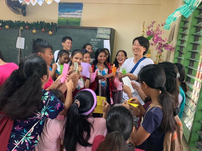 初日はオイスカ・マニラ事務所で一泊し、翌早朝、当組織の支援拠点である西ネグロス州バゴ研修センターに移動、早速、日本語を学ぶ研修生達との交流を図りました。 以降、バゴ研修センターが各地で展開する「子供の森」プロジェクトで提携している小中高校への訪問、マングローブ植樹を主に活動しました。 それぞれの学校では、熱烈な歓迎を受け、派遣団が持ち込んだ折り紙や割り箸鉄砲などは子供達のみならず、先生達も興味津々でした。また、一緒にバレーボールを楽しんだりと、派遣者も純粋な子供たちと交流することで、気付かされることがあったのではないかと思います。