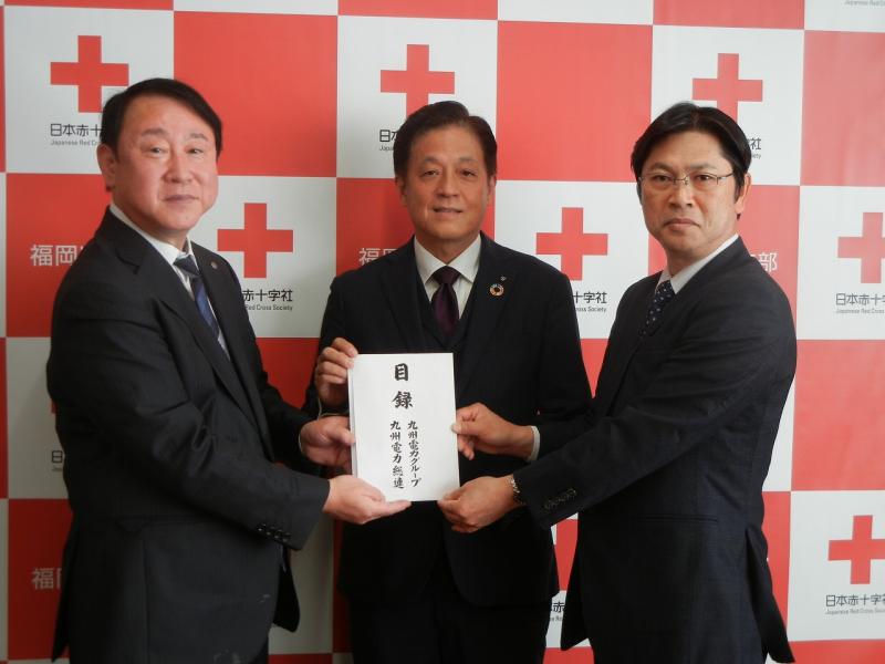 集計後、配分確認を行い、九州電力グループ6,512,439円・九州電力総連5,695,128円の配分を決定しました。 趣旨に賛同して頂いた皆様の九州電力グループ特別カンパ金は、九州電力㈱ 田中地域共生本部総務部長及び九州電力総連 林会長より日本赤十字社福岡県支部へ贈呈致しました。松本事務局長さまからは、「ご協力に対する御礼」また、「被災地の方々への支援に活用」すると述べられております。 九州電力総連は、九州電力グループ配分金と趣旨に賛同して頂いた九州電力総連加盟組合で九電グループ会社でない17社の820,584円を加えた、6,515,712円から、「令和元年8月の前線に伴う大雨」被災者見舞金を差し引いた金額を、電力総連へ送金する予定です。