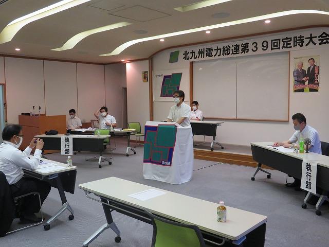 今大会は、新型コロナウイルスの感染拡大防止のため、九州電力総連の開催方針を参考に、やむなく単組代表代議員による大会構成員の縮小等や開催時間の短縮を図り、受付では手指消毒・検温の実施、マスク着用の徹底等の対策を図り執り行った。