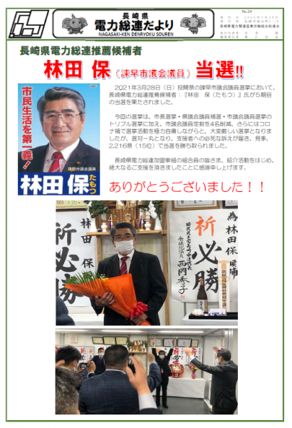 2021年3月28日(日)投開票の諫早市議会議員選挙において、長崎県電力総連推薦候補者:『林田保(たもつ)』氏が5期目の当選を果たされました。