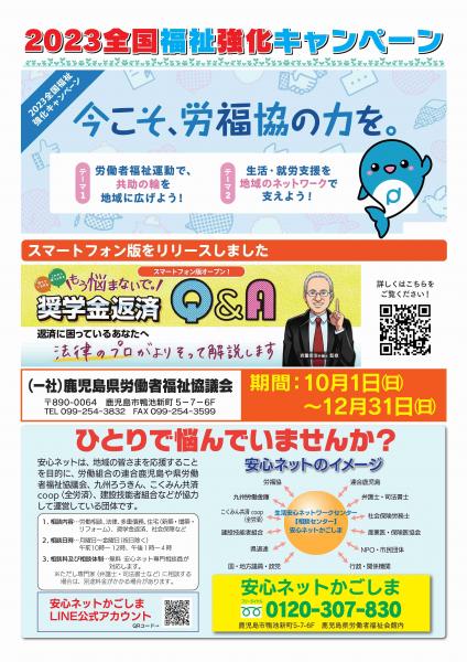 鹿児島県労福協では、10月1日(日)から12月31日(日)まで、2022全国福祉強化キャンペーンが展開されています。 ひとりで悩まずに、労働組合にご相談ください。