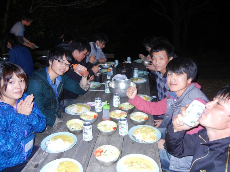 1日目は、「語ろう!電力関連産業のみんな!」と題して講義とグループディスカッションを行い、その後、アクション①「アウトドアの基礎知識を学ぼう」を実施。パワーポイントによるスタッフの説明で、火のおこし方や飯盒(はんごう)でのご飯の炊き方、ケガをした時の応急処置方法やロープワークについて学びました。その後、学んだ知識をすぐに実践すべく、アクション②「夕食を作ろう」として、ホワイトカレー・サラダ・チーズの燻製等を参加者全員で作りました。