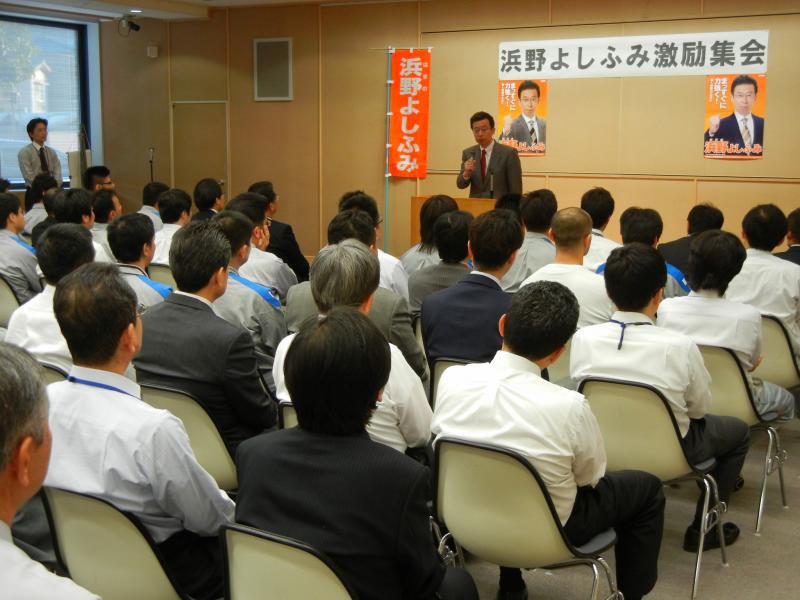 「浜野よしふみ」会長代理はオルグの中で、『九州をはじめ各地では、今夏の供給力を確保するため、職場で懸命な対応が続いています。そのような中、原子力発電所再稼働のための新基準への適合確認が今後実施されます。原子力発電所の再稼働問題は、燃料費の増大による貿易収支への影響、需給ひっ迫による産業活動への影響等、国民生活への影響は計り知れません。適合確認の実施については、八木電事連会長が記者会見で「安全が確認されていない状況が長期に亘らないよう、効率的に新基準の適合確認を」と述べているが、これは電力関連産業で働くすべての方々の思いであり、社会においても同様ではないでしょうか。原子力発電所の安全性確保を第一に、国益や国民利益を守る観点から、一刻も早い原子力発電所の再稼働に向け声を上げていくとともに、ぶれることのないエネルギー政策確立のために奔走してまいります。」と発言し電力総連が一体となって対応していく必要性を訴えました。