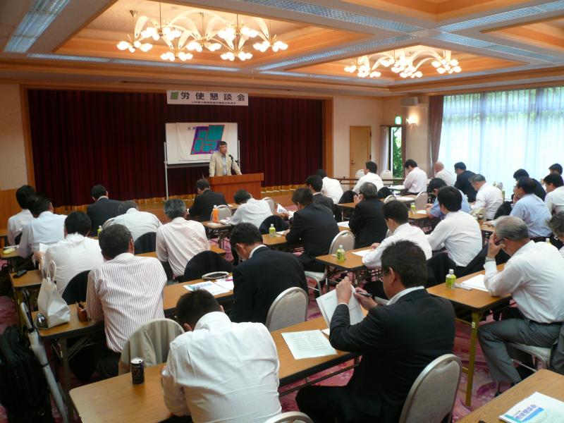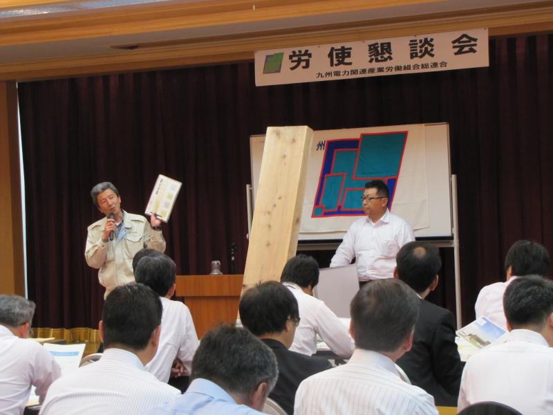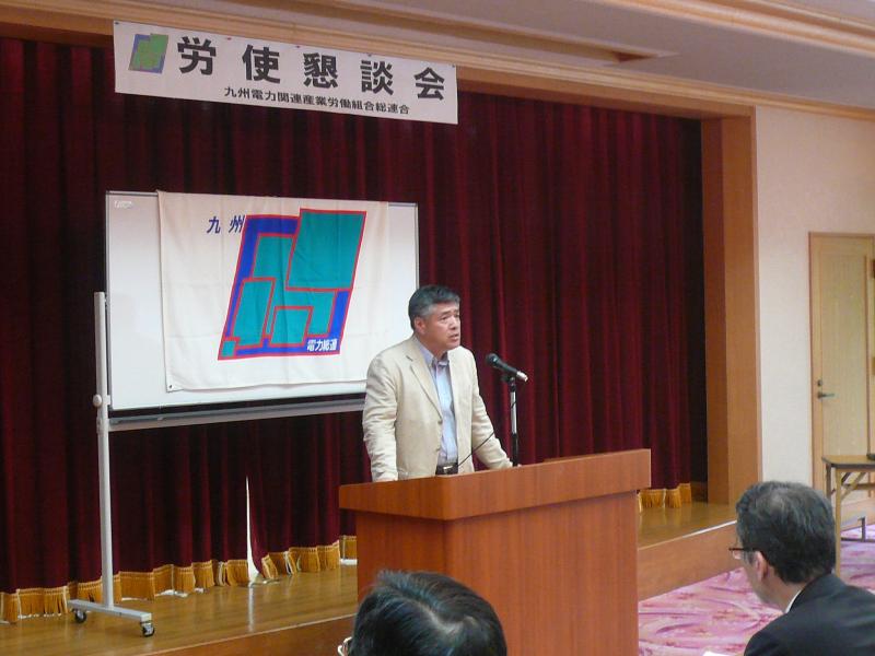 九州電力総連は、5月10日(金)に大分県由布市にて加盟単組役員67名、企業側50名の参加の下、労使懇談会を開催しました。この労使懇談会は、時事の労使課題等について情報の共有化を図り、健全な労使関係を醸成する場として毎年5月に開催しています。 今年度の労使懇談会においては、①九州電力の経営効率化の取り組み、②九州電力における原子力発電所の安全対策、③2012年度の安全衛生活動報告、④「浜野よしふみを支援する会」を取り巻く状況、⑤ステップアップ連帯購買運動等について情報と意識の共有化を図りました。